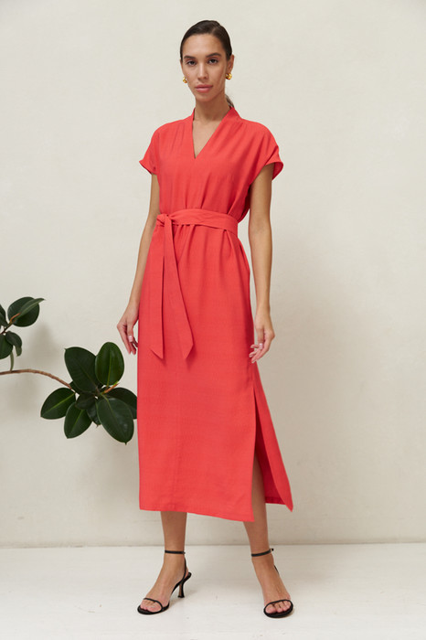 Платье из вискозной ткани с крэш-эффектом. Свободный силуэт с разрезом в боковом шве. По центру передней и задней части изделия выполнен шов. Цельнокроеная стойка, переходящая в V-образный вырез горловины, визуально делает фигуру стройнее. Цельнокроеный короткий рукав. В комплекте пояс из основной ткани.