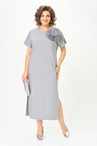 Платье свободного силуэта из плательной ткани. По центру передней части изделия выполнен шов. Цельнокроеная стойка, переходящая в V-образный вырез горловины, визуально делает фигуру стройнее. Втачной короткий рукав.