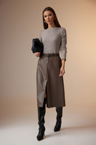 Платье свободного силуэта из ткани с крэш-эффектом, отрезное по линии талии. Нижняя части платья с воланами. Рукав-реглан до локтя. По низу рукава сборка на резину. Линия плеча и линия горловина оформлены сборкой на резину. В комплекте пояс из основной ткани.