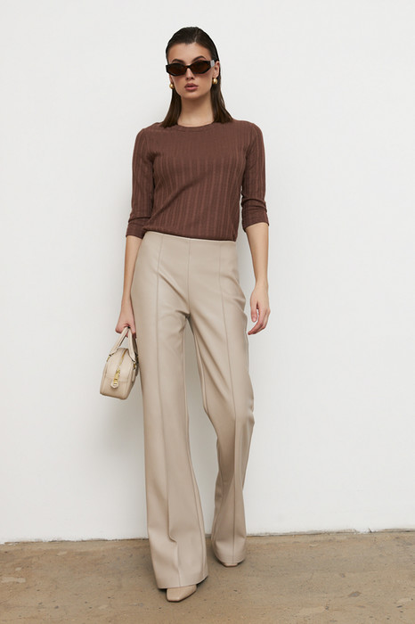 Брюки, зауженные в области колена и расклешённые книзу из эластичного полотна, с покрытием, имитирующим кожу. На задней части брюк по талии выполнены две вытачки. На передней части застрочены стрелки. Брюки без пояса на обтачке. В боковом шве потайная молния.