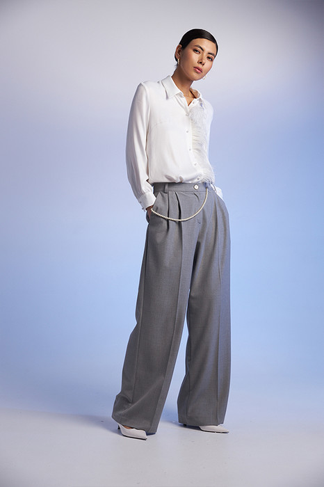 Брюки свободного силуэта из меланжевой костюмной ткани. На передней половинке выполнены карманы с подкройным бочком, по линии талии заложены складки. На задней половинке - талиевые вытачки и имитация карманов в рамку. Притачной пояс со шлёвками. Застёжка на молнию-гульфик и пуговицу. Такой крой выгодно подчеркнёт длину ваших ног.