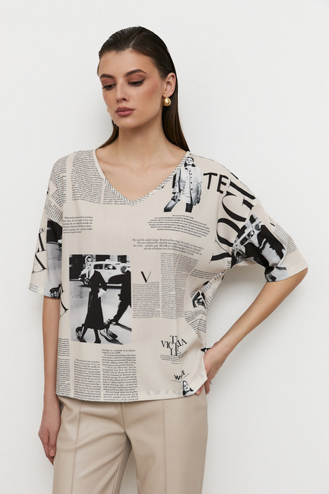 Блуза свободного силуэта из блузочной ткани. Низ изделия асимметричной длины (спинка удлинена относительно переда) с разрезами в боковых швах. Втачной рукав в спущенную пройму. V-образный вырез горловины оформлен косой бейкой из основной ткани.