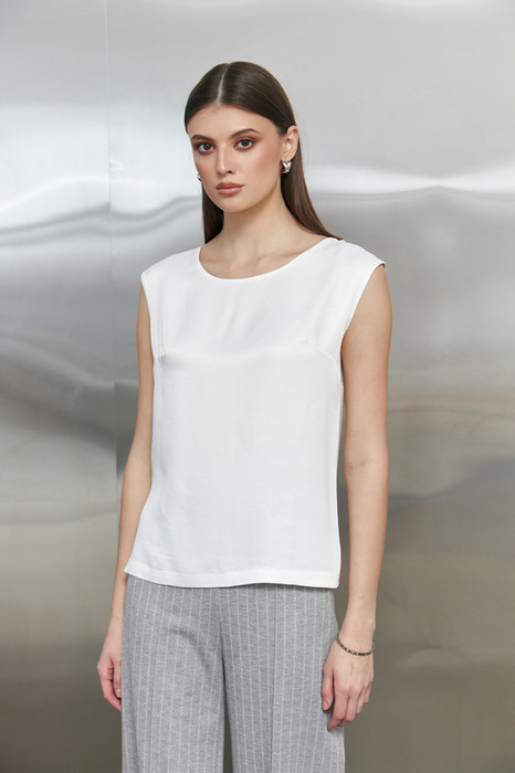 Топ из вискозной ткани с сатиновым блеском. Свободный силуэт, с небольшими разрезами в боковых швах. Круглый вырез горловины и линии проймы окантованы косыми бейками из основной ткани.