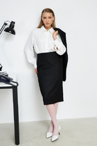 Платье из эластичного полотна с жаккардовым узором. Изделие свободное в верхней части и прилегающее в области талии и бёдер. Лиф изделия оригинального кроя в стиле кимоно. Цельнокроеная стойка переходящая в запах, визуально делает фигуру стройнее. По центру задней части платья выполнен шов, снизу небольшой разрез. В комплекте пояс. В таблице размеров представлены параметры человека, а не изделия.