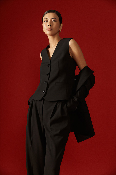 Жилет полуприлегающего силуэта с застёжкой на пуговицы из костюмной ткани. На передней части изделия нагрудные вытачки переведены в рельефы и линию кармана. Карманы прорезные, с листочкой. Спинка со средним швом, рельефами и плечевыми вытачками. Длина жилета до уровня линии бедер. Жилет на притачной подкладке.