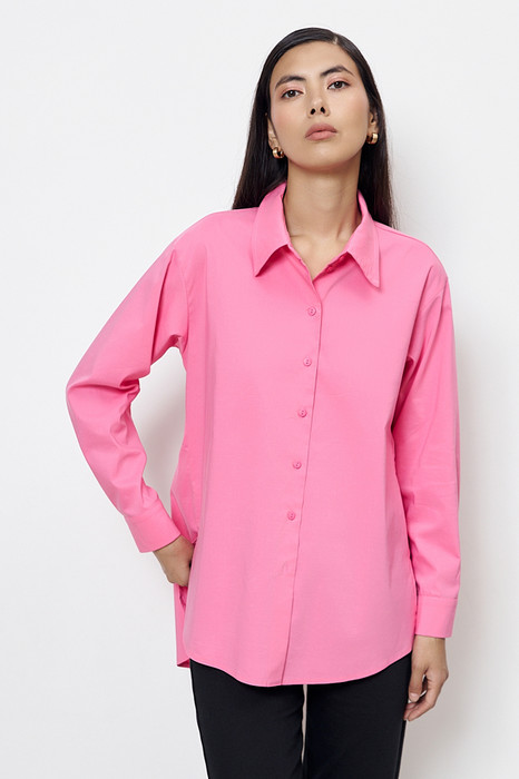 Рубашка из хлопковой ткани свободного силуэта с застёжкой на пуговицы. Низ изделия асимметричной длины (спинка удлинена относительно переда) с закруглениями по бокам. Вырез горловины обработан отложным воротником на стойке. Рубашечный рукав на манжете с застёжкой на пуговицы. На задней части изделия выполнена кокетка с небольшой складкой. Достоинство этой модели - в способности скрыть некоторые недостатки фигуры. Её можно сочетать как с брюками, так и с джинсами.