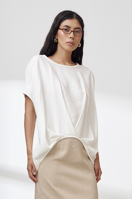 Блуза из вискозной ткани с крэш-эффектом. Свободный крой асимметричной длины (спинка удлинена относительно переда). Спущенное плечо. Линия проймы, линия горловина и низ изделия окантованы косой бейкой из основной ткани. Изюминкой являются оригинальные складки на передней и задней части изделия.