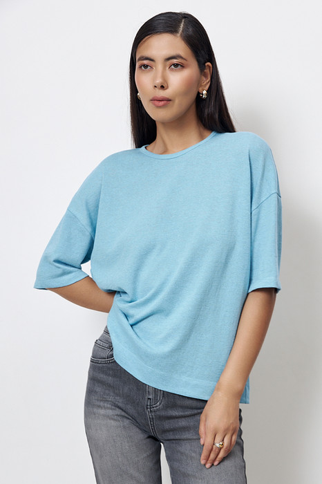 Джемпер из хлопкового эластичного полотна. Свободный силуэт со спущенной линией плеча и рукавом до локтя. Вырез горловины окантован эластичной бейкой. В таблице размеров представлены параметры человека, а не изделия.