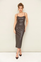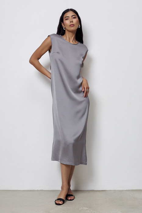 Платье из вискозной ткани с сатиновым блеском. Полуприлегающий силуэт, с разрезом в боковом шве. По среднему шву спинки застёжка на петлю-пуговицу. Круглый вырез горловины и линия проймы окантованы косыми бейками из основной ткани.