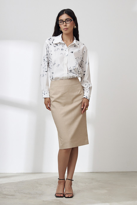 Юбка прилегающего силуэта из меланжевой костюмной ткани. Сзади по среднему шву застёжка-молния, снизу шлица с разрезом. Изделие без пояса, верхний срез обработан обтачкой. На передней и задней половине юбки выполнены талиевые вытачки. Юбка на притачной подкладке.
