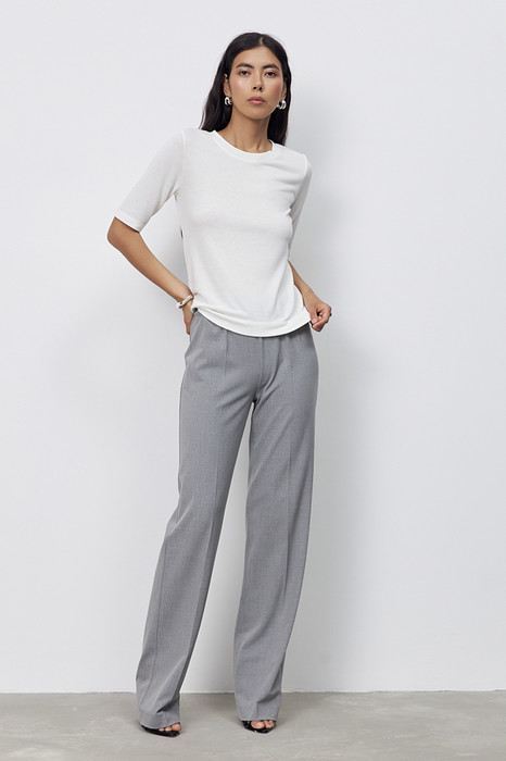 Брюки прямого силуэта из костюмной ткани. Пояс притачной с эластичной резиной.