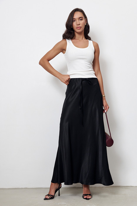 Юбка из вискозной ткани с сатиновым блеском, расширенная книзу. Крой юбки по косой. Пояс с эластичной резиной и кулиской.