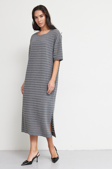 Двойное платье из эластичного полотна. Верхнее платье свободного силуэта с разрезом в боковом шве. Изделие со спущенной линией плеча и коротким рукавом. Круглый вырез горловины. Нижнее платье (подкладка) из вискозного эластичного полотна. В таблице размеров представлены параметры человека, а не изделия.