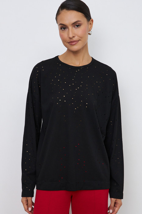 Джемпер из эластичного полотна с перфорацией. Свободный силуэт со спущенной линией плеча и длинным рукавом. Вырез горловины окантован эластичной бейкой. В таблице размеров представлены параметры человека, а не изделия.