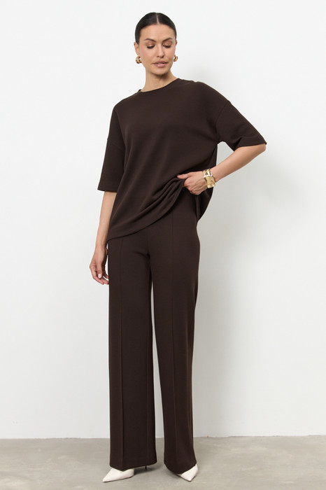 Брюки из эластичного полотна прямого силуэта. Пояс притачной с эластичной резиной. На передней части брюк застрочены стрелки.