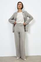 Брюки из эластичного полотна прямого силуэта. Пояс с эластичной резиной. На передней части брюк застрочены стрелки.
