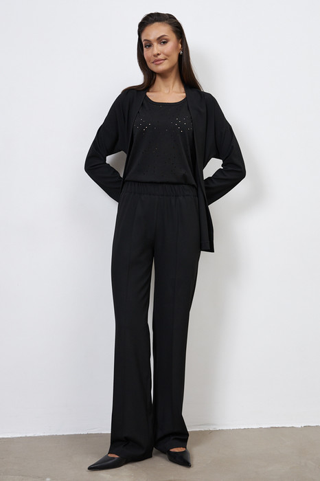 Брюки из костюмной ткани прямого силуэта. Пояс притачной с эластичной резиной.