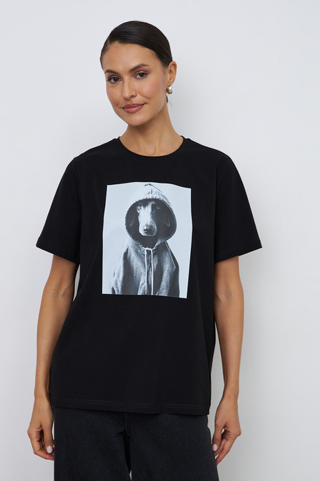 Джемпер из хлопкового эластичного полотна свободного силуэта. Втачной короткий рукав. Круглый вырез горловины оформлен бейкой.