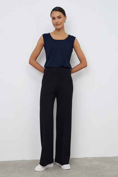 Брюки из эластичного полотна прямого силуэта. На передней части брюк застрочены стрелки. Пояс с эластичной резиной.