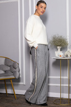 Костюм из эластичного полотна. Джемпер свободного силуэта со спущенной линией плеча и рукавом до локтя. Вырез горловины оформлен бейкой из основной ткани. Брюки прямого силуэта. Пояс с эластичной резиной. На передней части брюк застрочены стрелки.