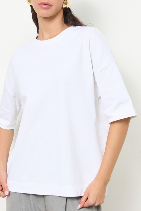 Джемпер из эластичного полотна. Свободный силуэт со спущенной линией плеча и рукавом до локтя. Вырез горловины оформлен бейкой. В таблице размеров представлены параметры человека, а не изделия.