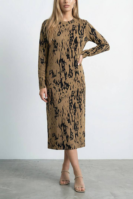 Платье полуприлегающего силуэта из эластичного полотна. Круглый вырез горловины оформлен притачной бейкой. Втачной длинный рукав.