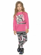 Спортивный костюм-двойка для девочек, состоящий из трикотажных брюк и простой футболки. Футболка из натурального хлопка (кулирная гладь) имеет округлый вырез горловины и короткие рукава. Яркие брюки с легким клешем прекрасно сочетаются со светлым верхом. Пояс на широкой резинке контрастного цвета обеспечивает удобную посадку на талии. Материал «кулирная гладь» (95 % хлопка и 5 % эластана), за счет добавления стрейча брюки отлично облегают фигуру. Их можно сочетать с другими футболками. Данный комплект прекрасно подойдет для прогулок, активных игр и уроков физры.