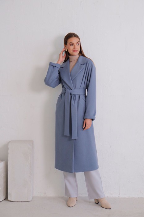 Современное удлиненное пальто прямого кроя с небольшим запахом. Воротник английский с широкими лацканами, плечо спущенное, по низу рукавов отложные манжеты. По среднему шву спинки внизу - шлица. Пальто с карманами, на завязывающемся поясе. Застёжка на металлические пальтовые кнопки.