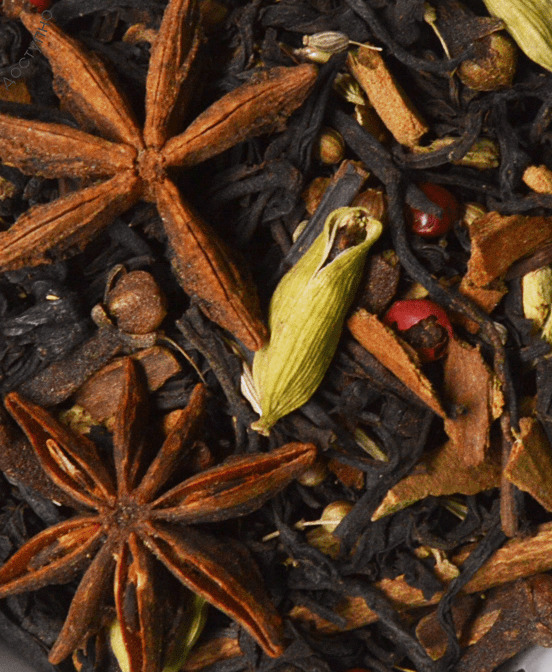 Купаж из классических черных индийских чаев с добавлением корицы, корня имбиря, гвоздики, бадьяна, кардамона, перца розового, перца душистого (горошек), фенхеля, аниса, кориандра. Не содержит ароматизаторов.
