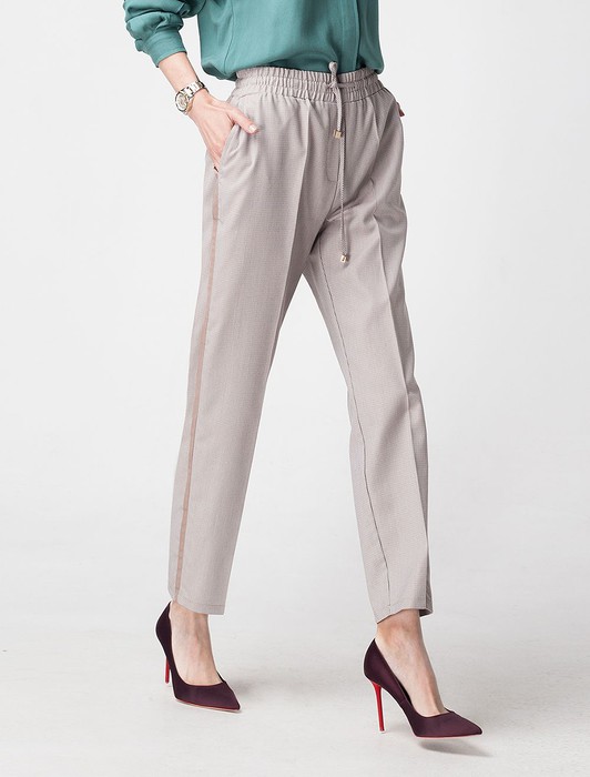 Состав: 77%ПЭ 20%Вис 3%ПУБрюки выполнены из тонкой костюмной ткани в мелкую гусиную лапку двух оттенков бежевого цвета. Актуальным акцентом является лампас, шириной 1,5 м из т.бежевой репсовой ленты. Пояс на резинке и завязках