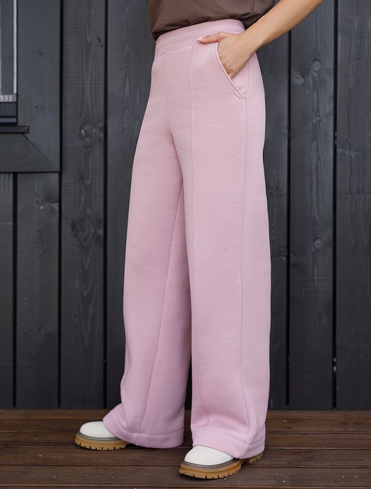 Эти уютные брюки пыльно-розового цвета созданы для вашего комфорта. Свободный прямой крой обеспечивает свободу движений и максимальное удобство в любых ситуациях, поэтому они подойдут и на большие размеры, а так же на высокий или низкий рост. Фигура подчеркивается, а силуэт визуально вытягивается за счет кроя палаццо и застроченных декоративных стрелок.
