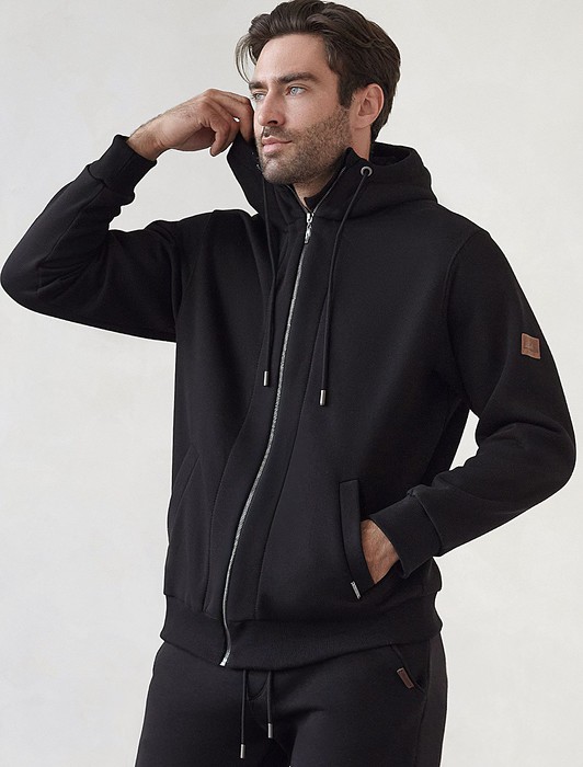 Состав: 80%Хлопок 20%ПЭ Плотность: 320 Г/м2Худи на молнии выполнено из премиального эластичного футера трехнитки с теплым начесом. Модель с капюшоном и воротом стойка дополнена боковыми карманами и нашивкой с логотипом бренда из эко-кожи. Ранней осенью или поздней весной можно носить в качестве верхней одежды. Высококачественная фурнитура цвета темное серебро. Изделие сочетается в костюме с брюками U44.006