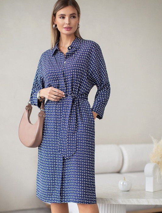 Состав: 59%Лиоцелл (Вис) 41%Вис Параметры модели на первом фото: Рост 170, бюст 89, талия 63, бедра 92Синее платье-рубашка с геометрическим принтом. Для пошива модели с отложным воротником и застежкой-планкой на перламутровые пуговицы использовали премиальную вискозу с матовым блеском, как у натурального шелка. Изделие из легкого материала сохраняет безупречный вид в течение всего дня. Подходит для любого типа фигуры. Пояс-лента подчеркивает талию и вносит изюминку расслабленного шика.