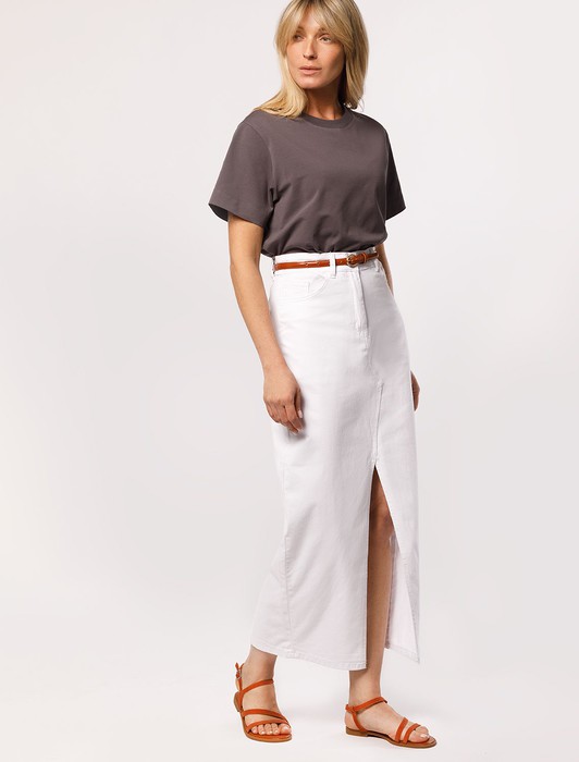 Состав: 80%Хлопок 18%ПЭ 2%ПУДлинная белая юбка выполнена из мягкого эластичного денима. Трендовый высокий разрез спереди добавляет чувственный характер лаконичному изделию и не сковывает шаг при ходьбе. Универсальный белый цвет сочетается с любым верхом. Подходит для любой фигуры.