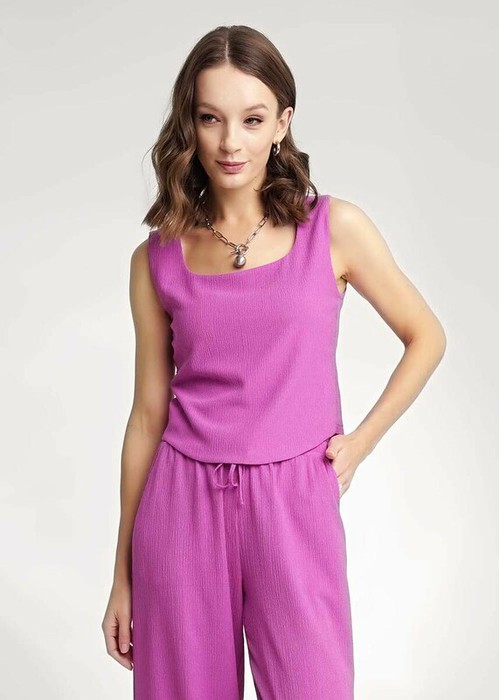 Джемпер без рукавов из трикотажного полотна джерси, среднее плечо. Двойной перед. По горловине спинки и пройме внутренняя узкая окантовка. Фигурный низ изделия.