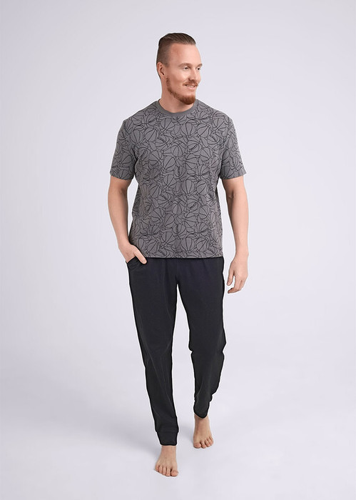 Комплект мужской состоящий из футболки и брюк. Футболка из фактурного трикотажного полотна в набивку с округлой горловиной и коротким рукавом. Брюки из трикотажа на широком поясе с резинкой и регулируемым шнуром, по бокам удобные карманы.