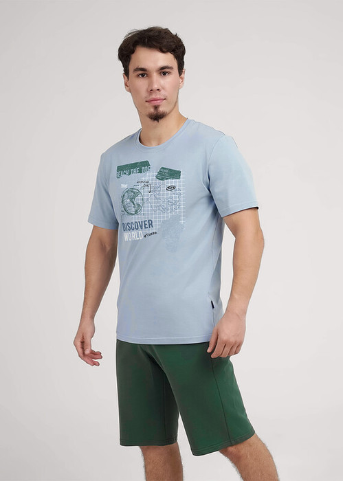 Комплект мужской для дома состоящий из футболки и шорт. Футболка из трикотажного полотна с круглым вырезом горловины, коротким рукавом и стильным принтом. Шорты из плотного трикотажного полотна на эластичном поясе с функциональными карманами и шнуром.