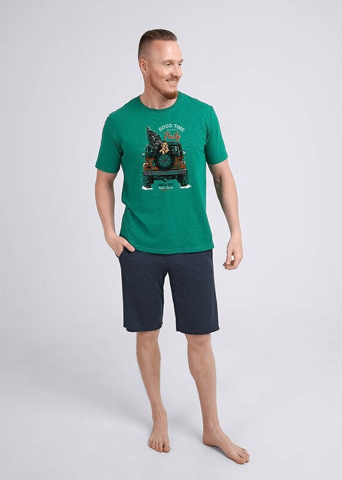 Комплект мужской для дома состоящий из футболки и шорт. Футболка из фактурного трикотажного полотна с круглым вырезом горловины, коротким рукавом и дизайнерским принтом. Шорты из трикотажа на эластичном поясе с функциональными карманами и шнуром.