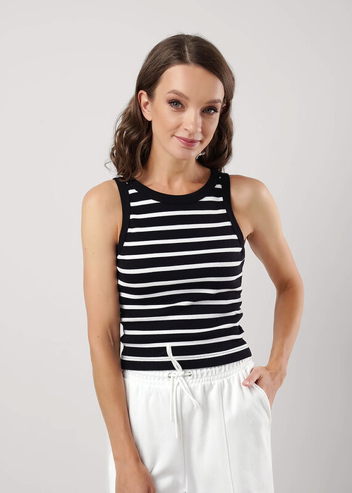 Майка для дома и отдыха из хлопкового трикотажного полотна с эластаном - кашкорсе. Умеренный объем. Средняя ширина бретели, округлая горловина. По горловине и пройме окантовка. Вшивка в боковом шве.