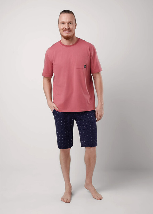 Комплект мужской для дома, состоящий из футболки и шорт. Футболка из трикотажного полотна с круглым вырезом горловины, коротким рукавом и карманом. Шорты из хлопкового полотна в набивку на эластичном поясе с функциональными карманами и шнуром.