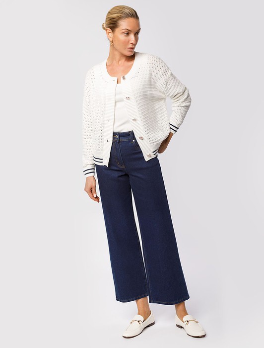 Состав: 85%Хлопок 13%Вис 2%ПУТемно-синие джинсы-кюлоты выполнены из эластичного денима. Высокая талия подчеркивает силуэт. Комфортная длина позволяет сочетать изделие с высокими сапогами и ботинками. Составьте уютный образ вместе со свитером крупной вязки или кашемировым жакетом. Изделие дополнено высококачественной металлической фурнитурой с логотипом бренда.