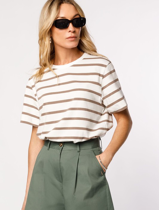 Состав: 92%Хлопок 8%ПУ Параметры модели на первом фото: Рост 172, бюст 88, талия 64, бедра 88Футболка выполнена из премиального хлопка. Наличие эластана гарантирует абсолютный комфорт и долговечность изделия. Модель в полоску предлагаем сочетать с однотонными вещами базовой палитры. Изделие дополнено металлическим логотипом бренда.