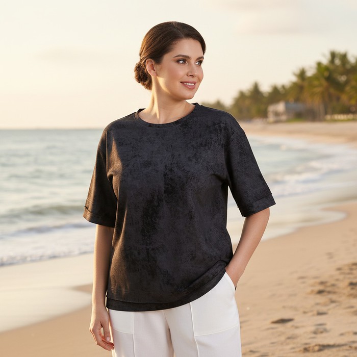 Футболка из гладкокрашеного трикотажного полотна «кулирка» с эффектом «варенки», свободного покроя, горловиной овальной формы, обработанной притачной планкой. Низ рукавов и изделия состоит из двух частей, одна из которых с необработанным краем, другая с подгибкой и соединенных между собой накладным швом.
