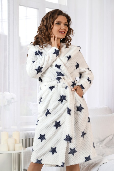 Халат молодежный из полотна «велсофт», прямого силуэта, на запахе, с втачными длинными рукавами, с капюшоном, карманами в боковых швах и съемным поясом, фиксирующимся на талии двумя шлевками в боковых швах.