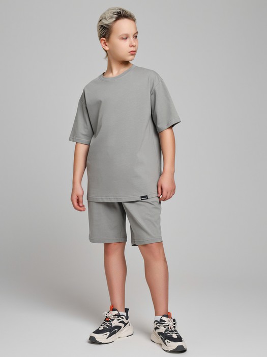 Костюмдля мальчика из плотного гладкокрашеного трикотажного полотна "кулирка", состоящий из футболки и шорт. Футболка - свободного покроя, с удлиненными плечевым и швами, короткими втачными рукавами и горловиной овальной формы, обработанной втачной планкой. В нижней части переда слева настрочен декоративный элемент прямоугольной формы. По горловине проложена отделочная строчка. Шорты - классического покроя, на притачном поясе с эластичной тесьмой внутри и карманами в боковых швах. Для регулирования степени прилегания шорт по талии в пояс вставлен шнурок, продетый через две петли в центре пояса.