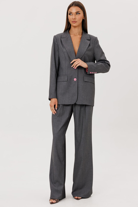 Стильный гармоничный комплект в стиле умеренного оверсайза, состоящий из свободного жакета и широких брюк. Эффектной деталью комплекта выступает высокая открытая шлица на спинке жакета, закрепленная пуговицами.