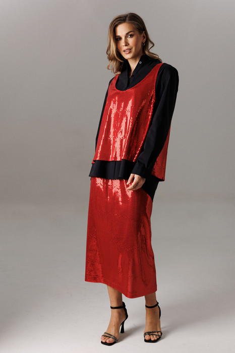 Юбка из трикотажного полотна с пайетками, прямого свободного силуэта на трикотажной подкладке. Линия талии оформлена притачным поясом на эластичной тесьме. Длина юбки по среднему шву спинки 79 см.