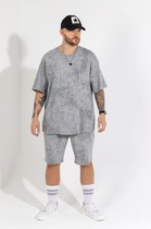 Костюм мужской, состоящий из футболки и шорт. Футболка - свободного покроя, короткими втачными рукавами и горловиной овальной формы, обработанной втачной планкой. По шву втачивания планки настрочена двойная отделочная строчка. Шорты - удлиненные, с карманами в боковых швах, на притачном поясе с эластичной тесьмой внутри.