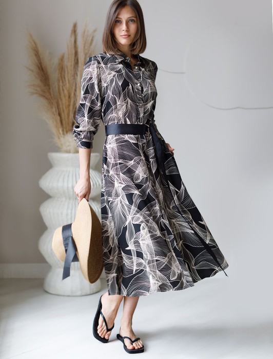 Состав: 100%Вис Параметры модели на первом фото: Рост 172, бюст 88, талия 64, бедра 88Платье А-силуэта с отложным воротником как у рубашки выполнено из премиальной вискозы. Модель с графичным растительным принтом дополнена удобными боковыми карманами и поясом из репсовой ленты. Застежка на золотистые пуговицы во всю длину изделия позволяем создать спереди нужный разрез. Материал – очень приятен к телу именно в осеннее время за счет его особенного плетения создает уютный обволакивающий эффект и в тоже время не теряет своей легкости.