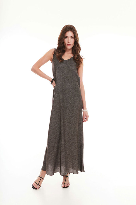 Платье женское, расширенное книзу, длиной макси, без рукавов. Спинка со средним швом.